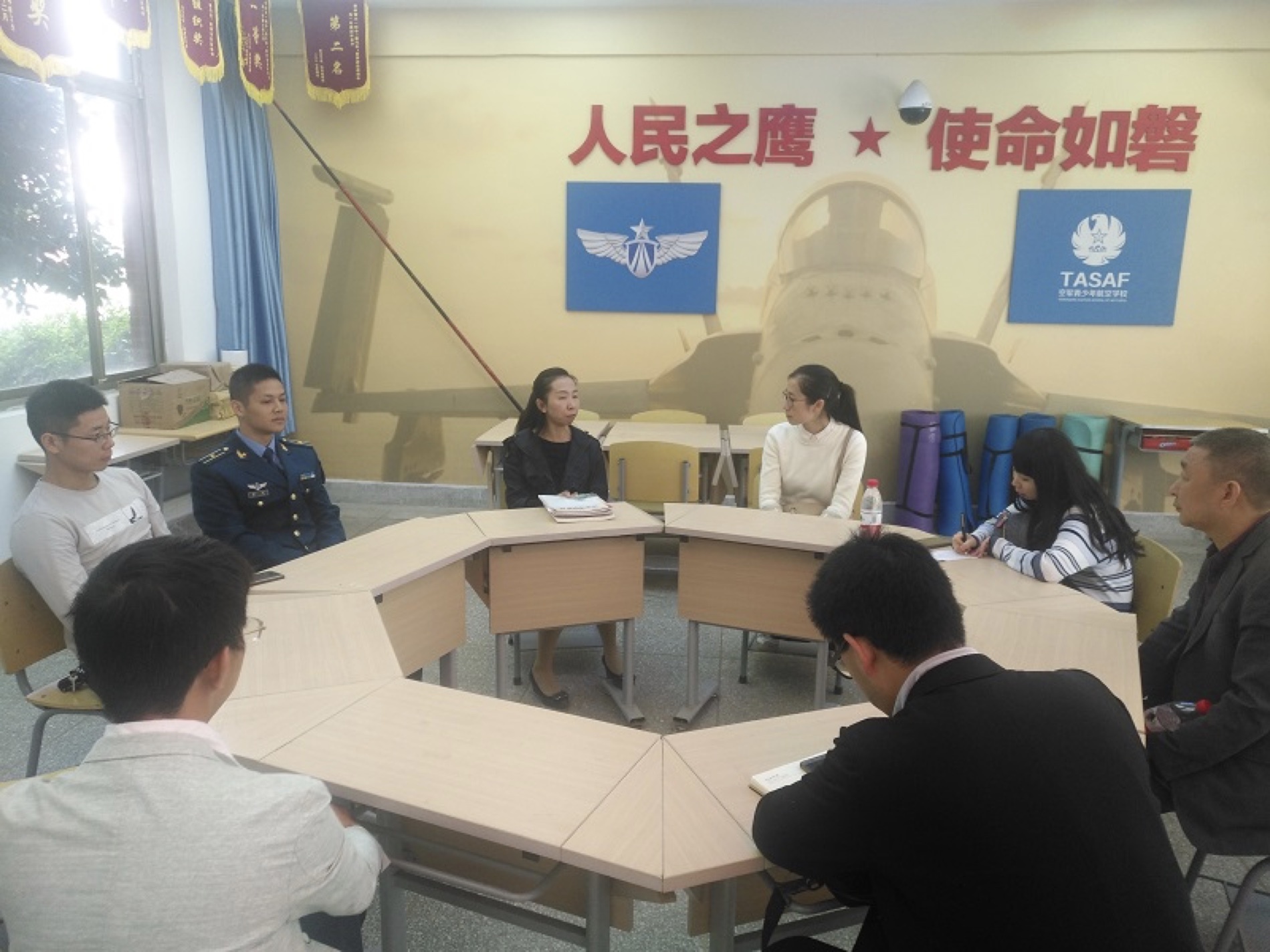 2018年11月2日上午,川大附中航空班部,分管领导及老师一行8人来我校交流访问。我校青少年航校联合办公室执行主任周斌、党办主任王晓莺、空军驻校干部谢鹏教导员以及三个年级航空班班主任谢颖、涂俊宏、李大伟予以接待。