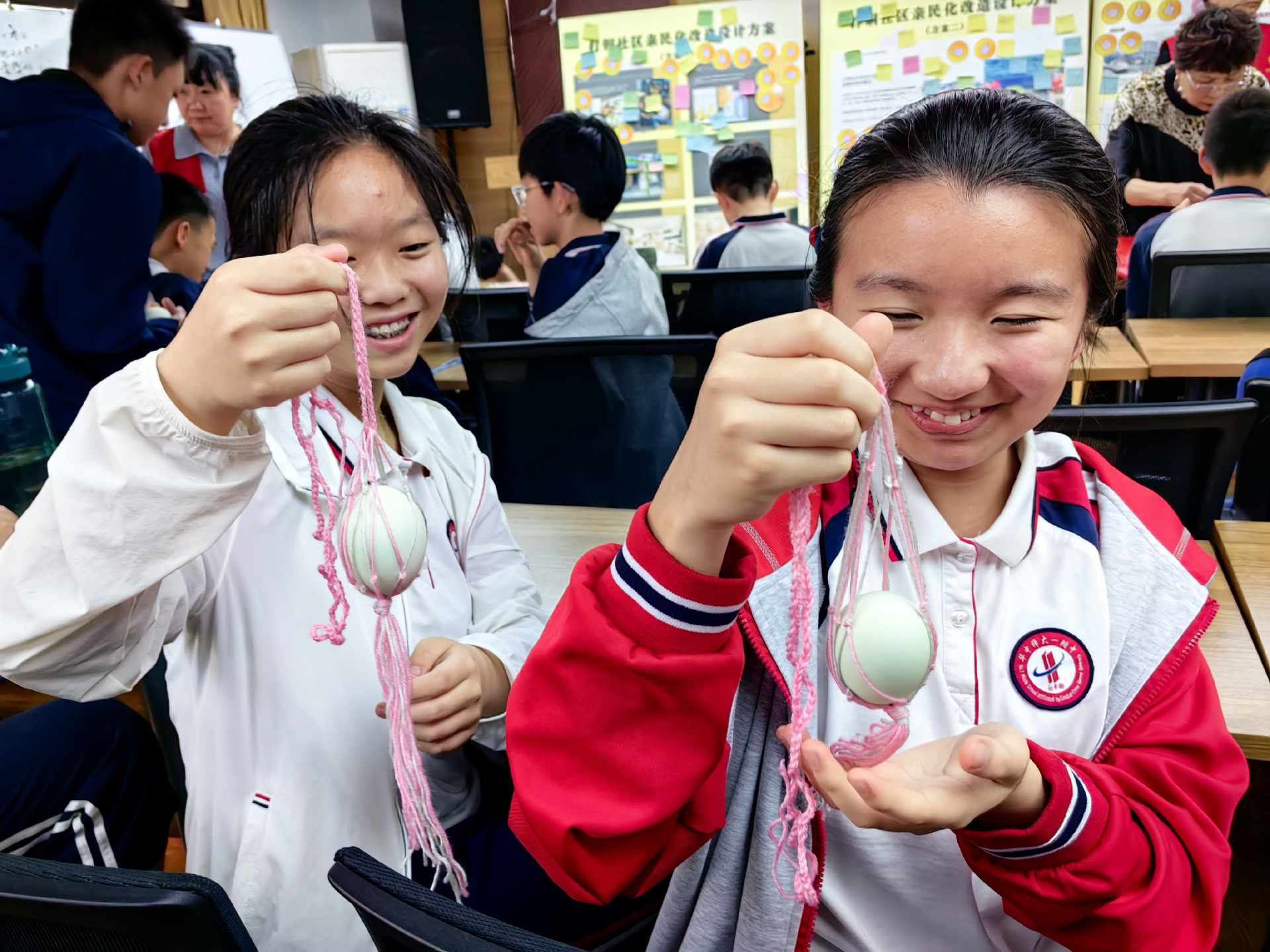 而编织蛋网活动中,在社区编织队奶奶们的耐心指导下,同学们认真学习编织技艺,在与长辈的交流互动中增进情谊,在一针一线的实践里感悟“匠心精神”。