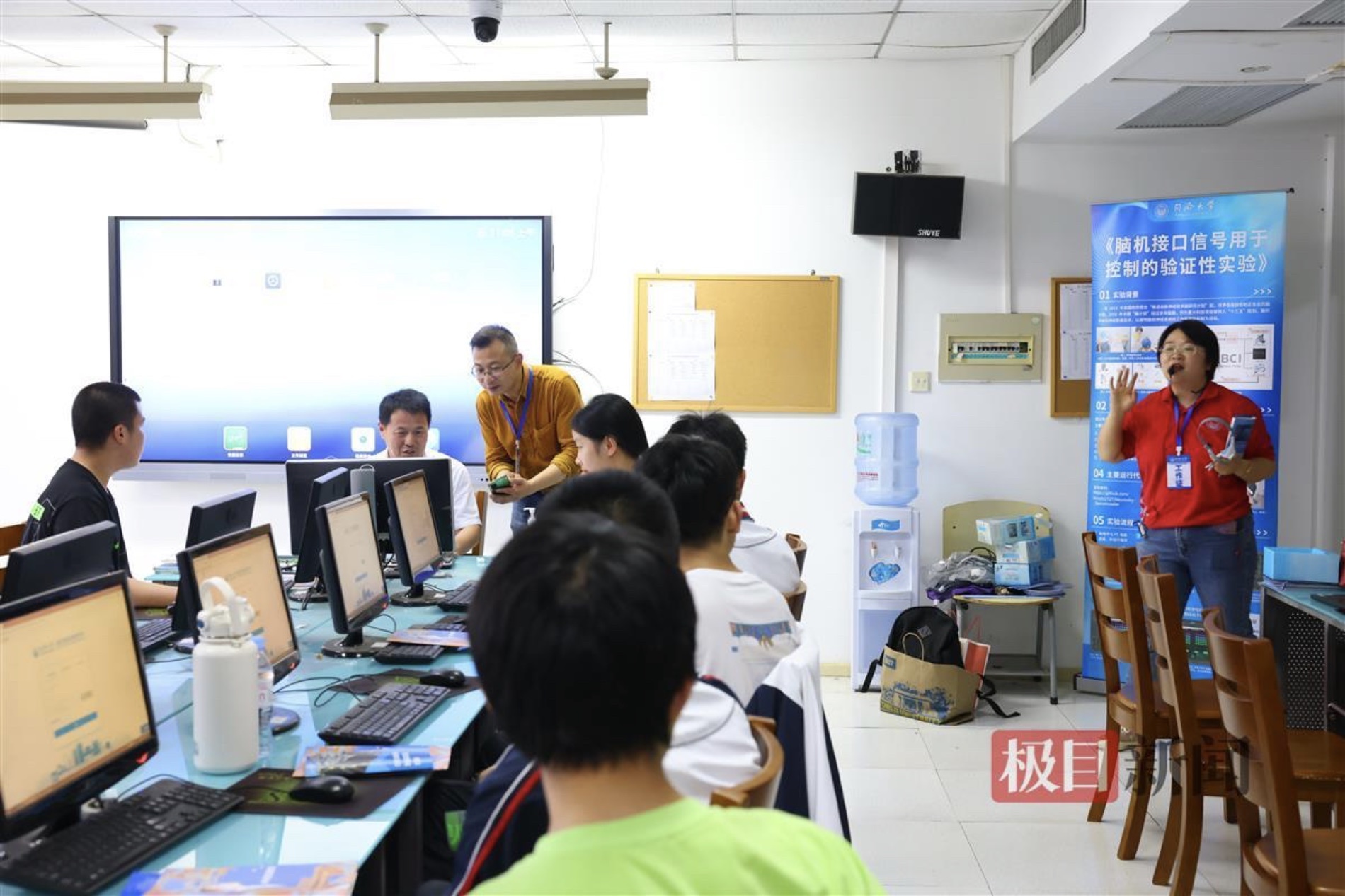 当天下午,在华师一附中的四号机房,同济大学龚晓亮高工团队带来了非常超前的脑科学研究初探体验活动。这一体验项目的全称为“任务态—功能磁共振影像虚拟仿真实验”,是国内首个国际化磁共振影像实验教学培训平台。依托3D虚拟技术,以“虚实”结合,寓教于乐的教学法,让不同背景和不同国度的学习者按需学习,该实验课程着眼于解决前沿交叉学科中大型仪器设备实验教学的关键难点问题,立意新颖、构思巧妙,设计合理,运用了递进式教学法,能满足不同层次的学习需求,有助于培养学生自主学习和解决复杂问题的能力。