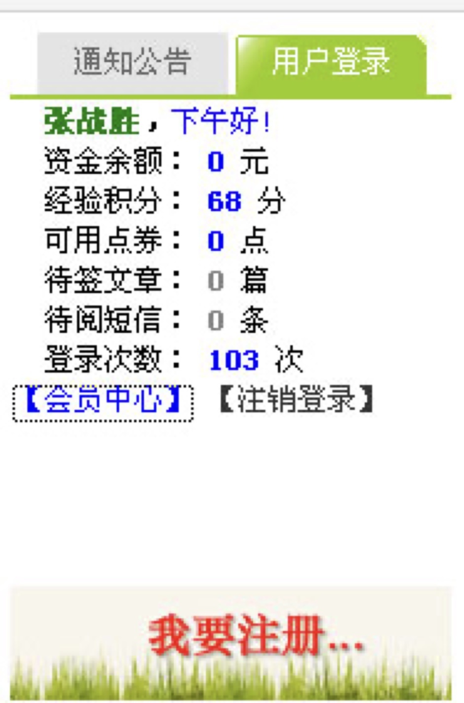 2、 登录后,点击会员中心进入会员中心。(注意:管理员和注册会员可以用户名一样,密码不一样,但是在用会员登录时请输入注册会员时的密码)