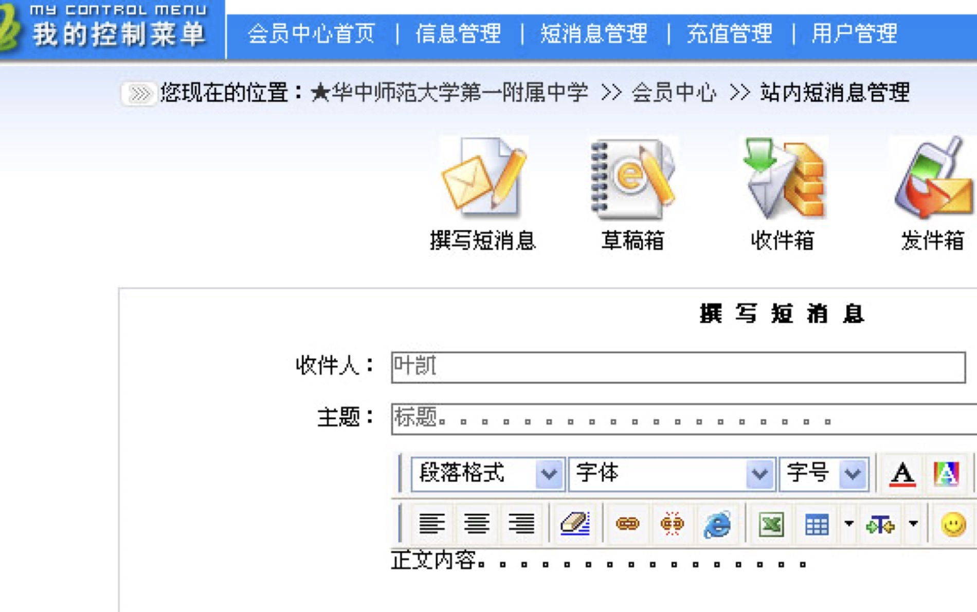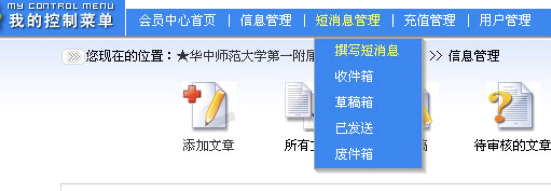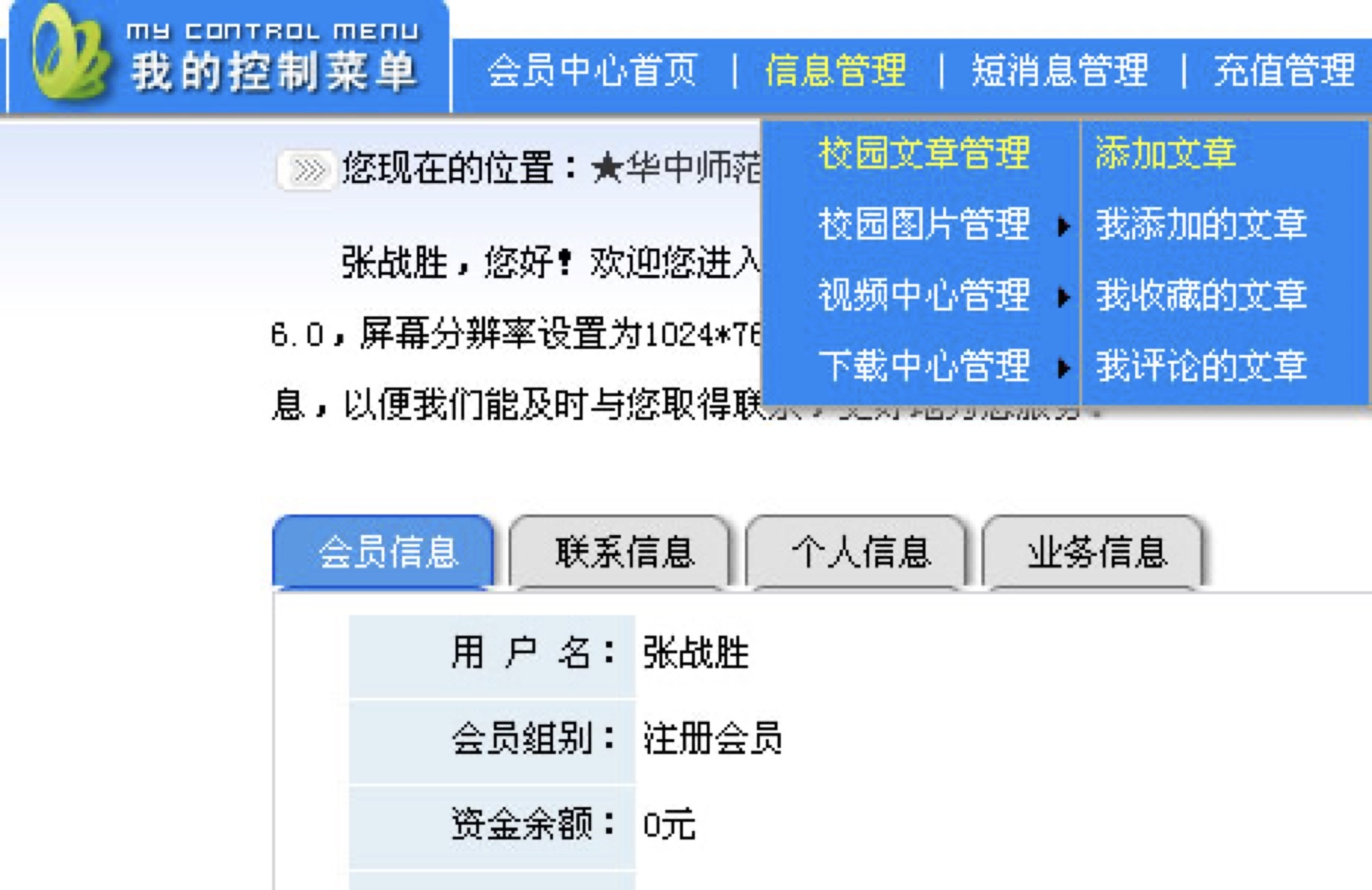3、 进入会员中心后,把鼠标移到相应栏目,即可执行相应的操作,包括发表文章和发送短消息。如:单击信息管理——校园文章管理——添加文章,即可进入发布文章的界面。