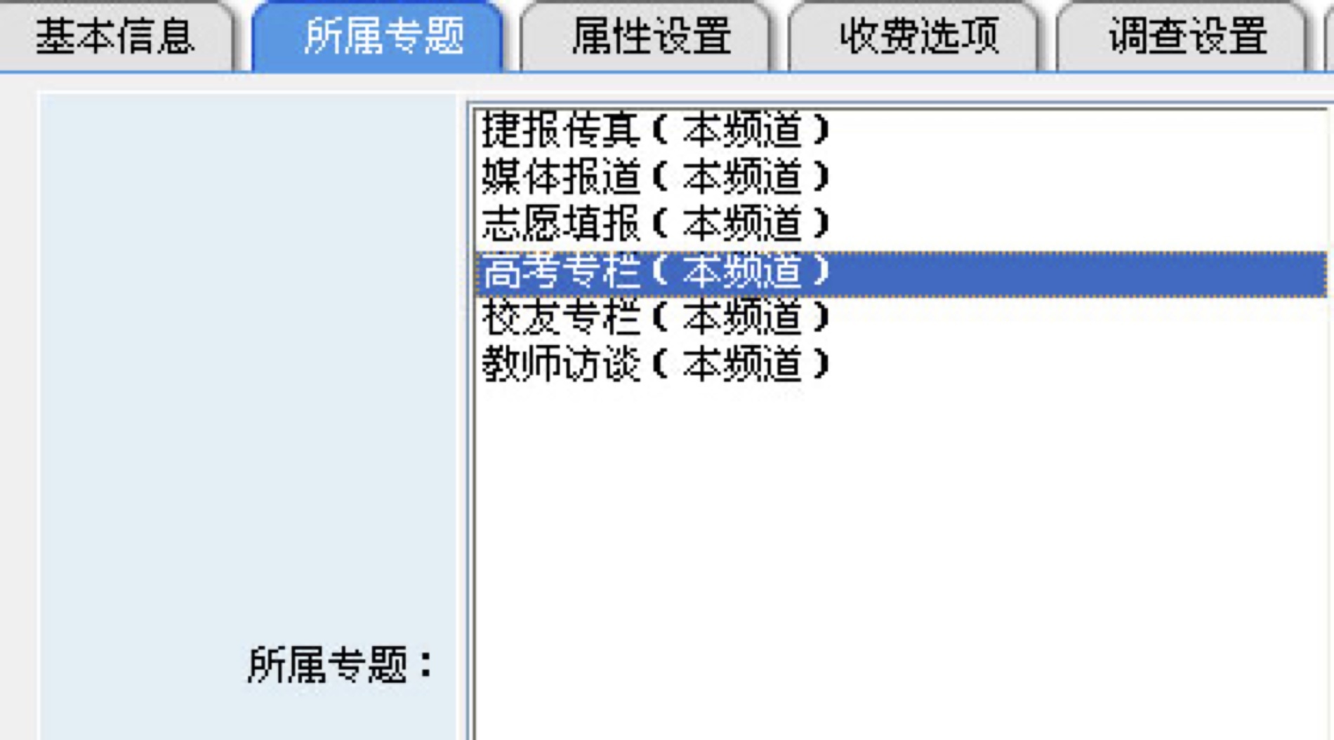 5、所属专题的选择:所发文章可能同时属于某个专题,请点击所属专题,选择文章所属于的专题,“年级组”频道中没有专题。