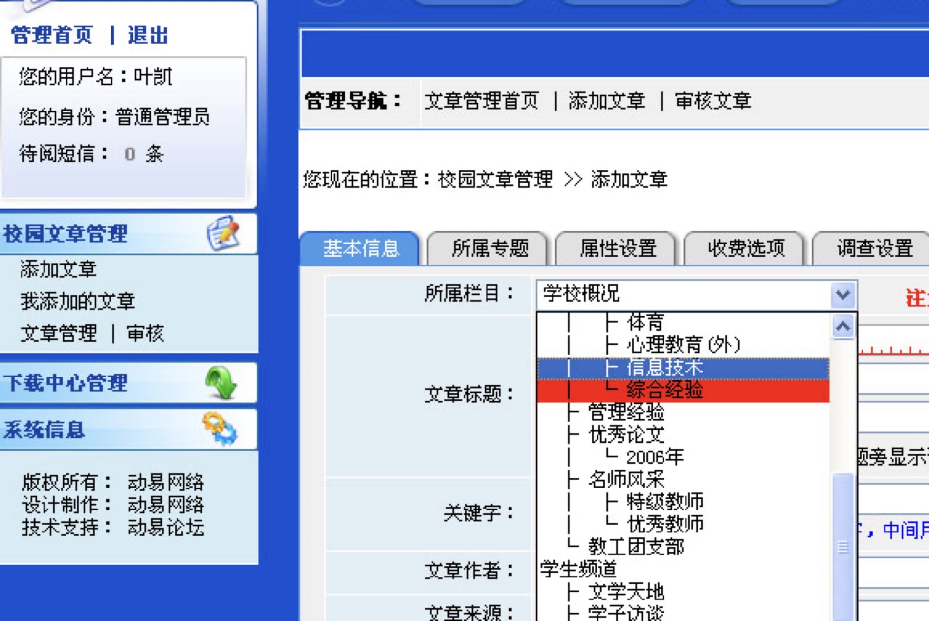 2、进入管理后台后,点击左边的“校园文章管理”或“年级组管理”,这里视您的权限,左边显示的菜单不一样。点击“添加文章”。如下图,所属栏目里请选择背景为红色的栏目或其子栏目,如果该栏目下有子栏目,那么不能在该栏目下发表文章,务必选择最后一级子栏目。