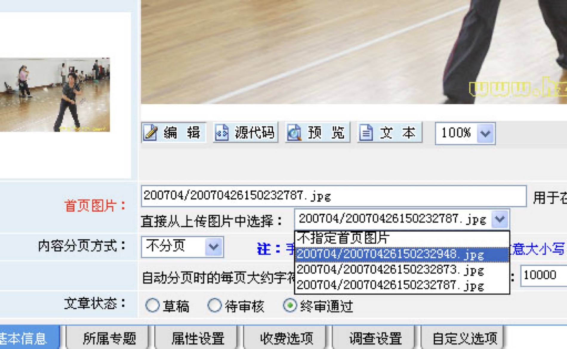 4、正文下方的首页图片,默认为上传在正文中的最新一张图片,可以根据需要在下面选择“不指定首页图片”或正文中的其他图片。这个图片请尽量选择一张最适合在首页显示的图片。(注意:学校网站是学校对外宣传和交流的一个窗口,请不要发布个人色彩较浓的文章和图片,对于不能确定是否需要发布的文章和图片,可以放在待审核里)。