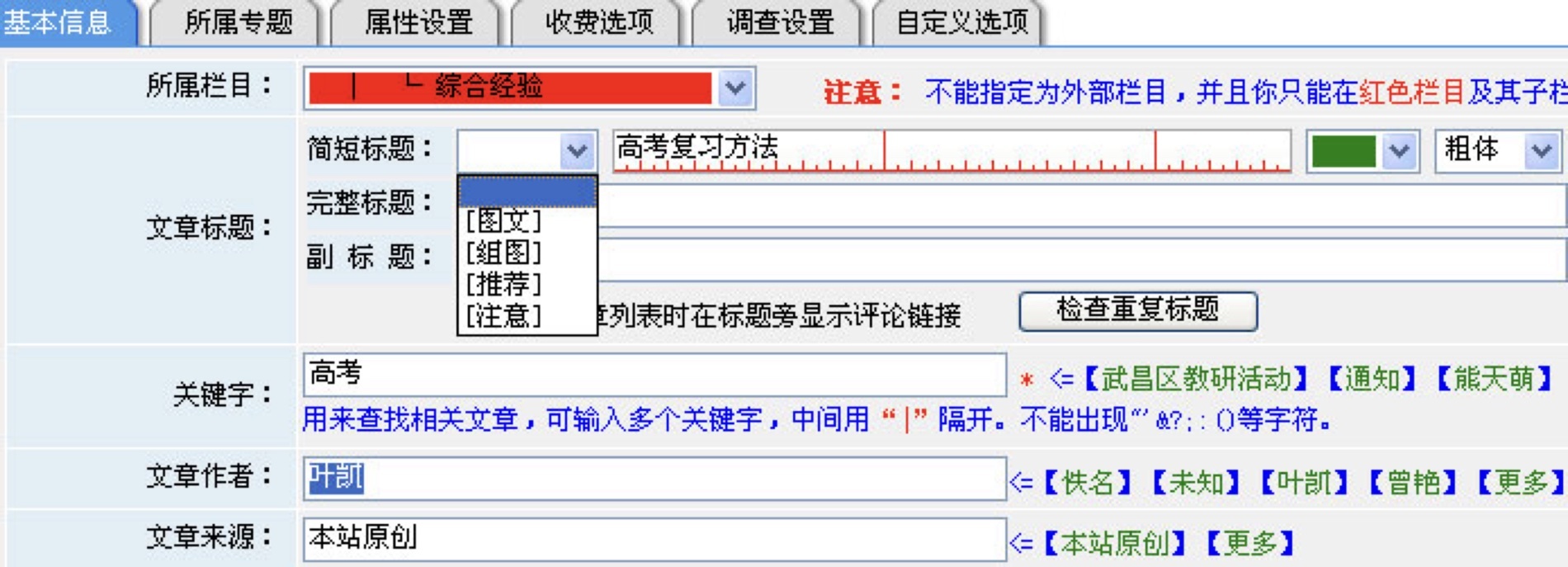 3、选择好栏目后,在简短标题一栏输入完整的标题,注意,前面的下拉条中不需要选择“图文”和“组图”,因为如果文章中含有一张图片,则文章标题前会自动加上“图文”,含有两张或两张以上图片的文章,会在标题前自动加上“组图”。完整标题和副标题可以留空,关键字为标题中的文字,方便用户搜索,文章作者是该正文的作者而不是发布者的名字,请如实输入,文章来源请输入相应的来源,如“高一年级”。