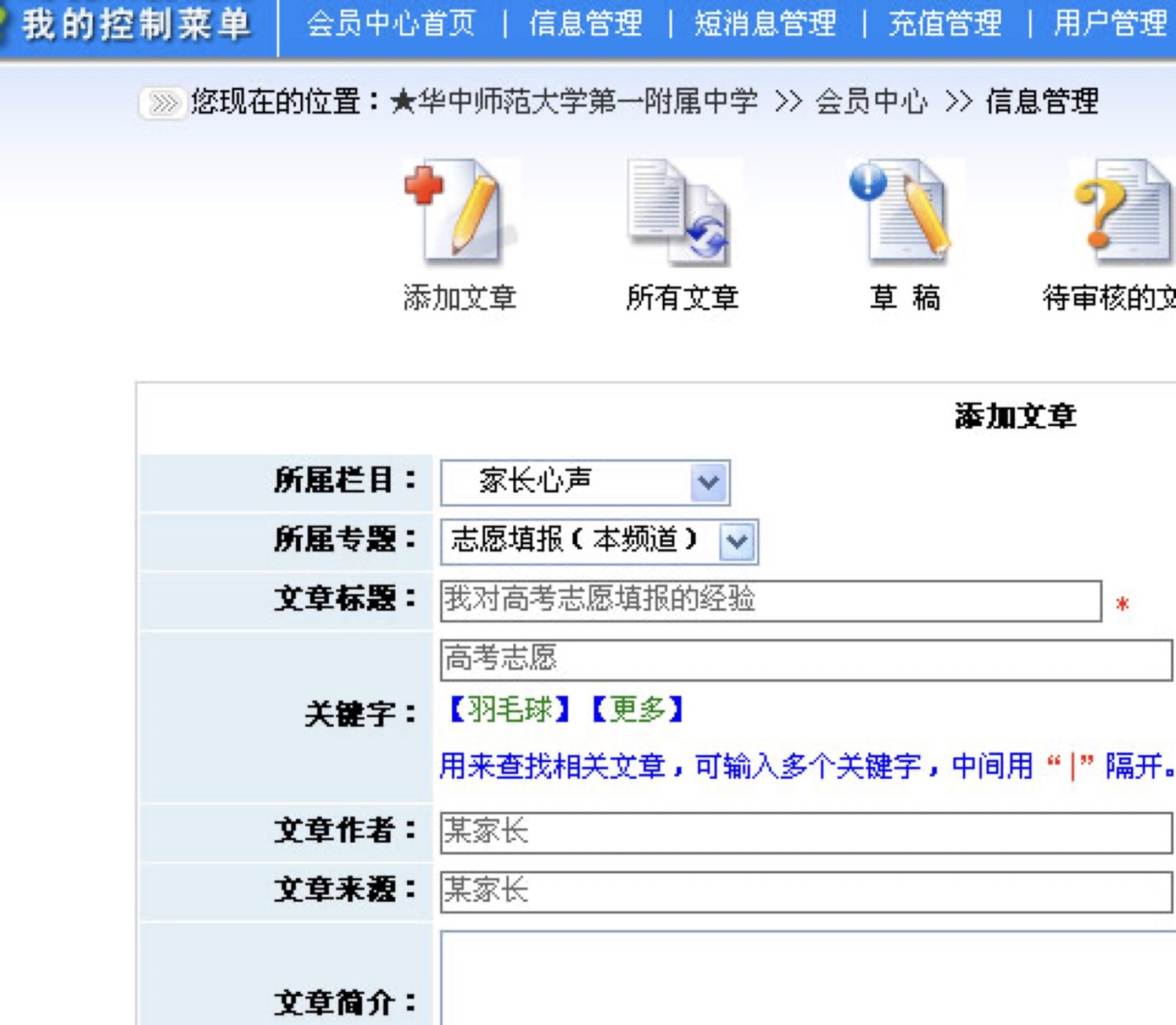 4、 发布文章时请如实填写相应栏目、是否属于专题、标题、关键字、作者和来源。如果是新闻文章,最好在文章简介中留下真实联系方式(我们在审核时会去掉联系方式),以便于我们和您联系,以确认文章内容的真实性。