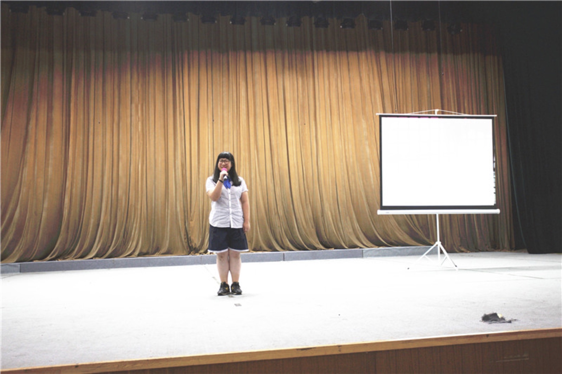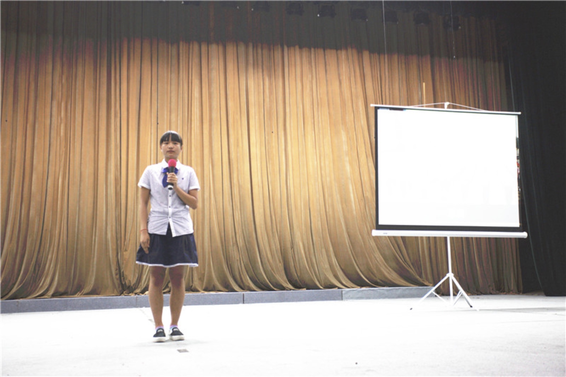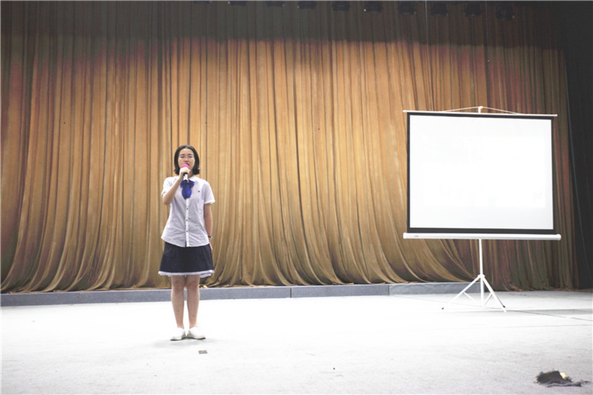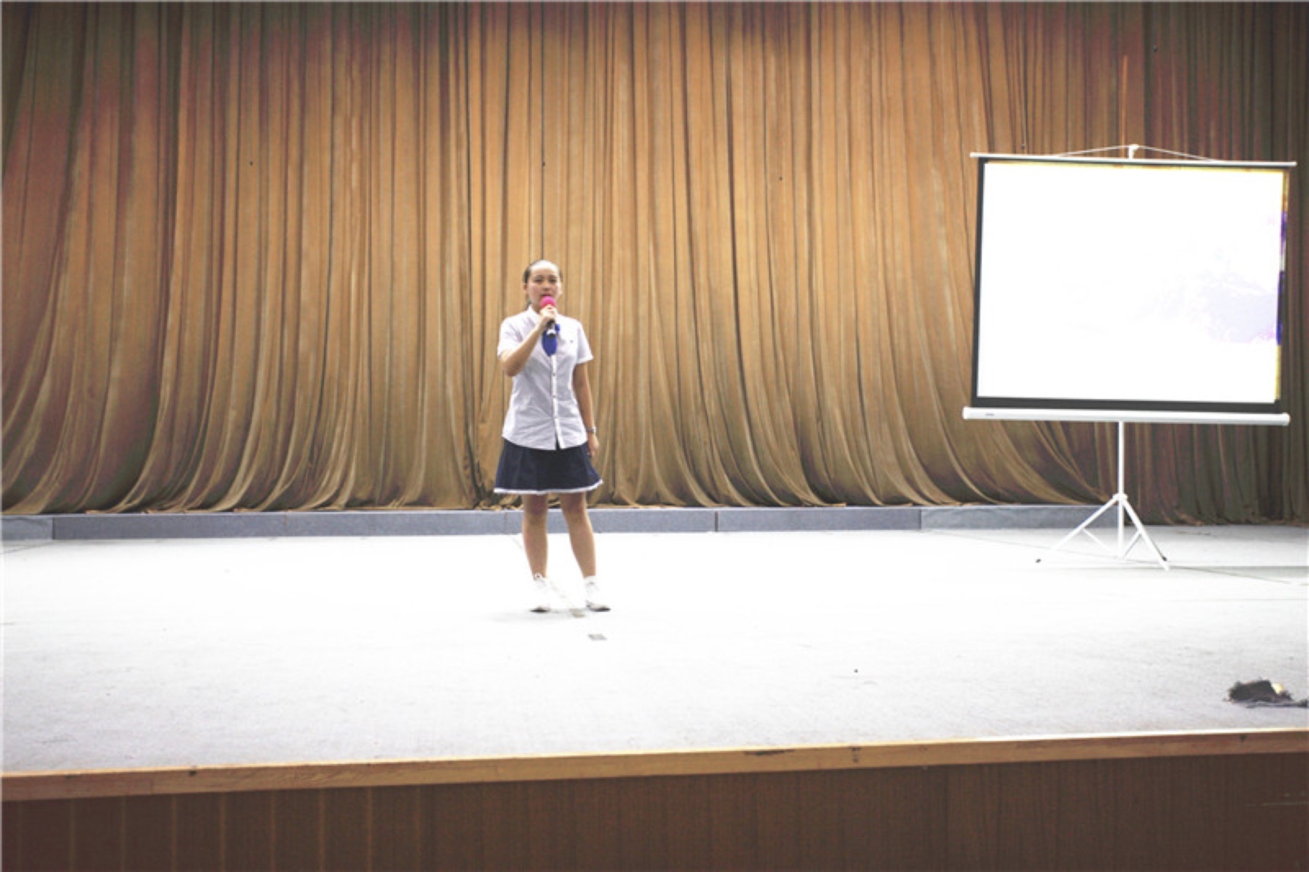 我是来自高一五班的唐怡雯,今天我演讲的题目是《走在厚德广场上》。