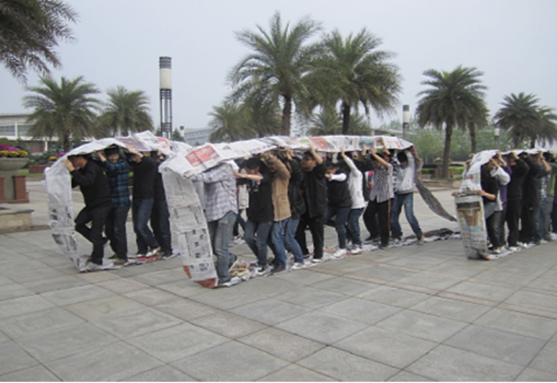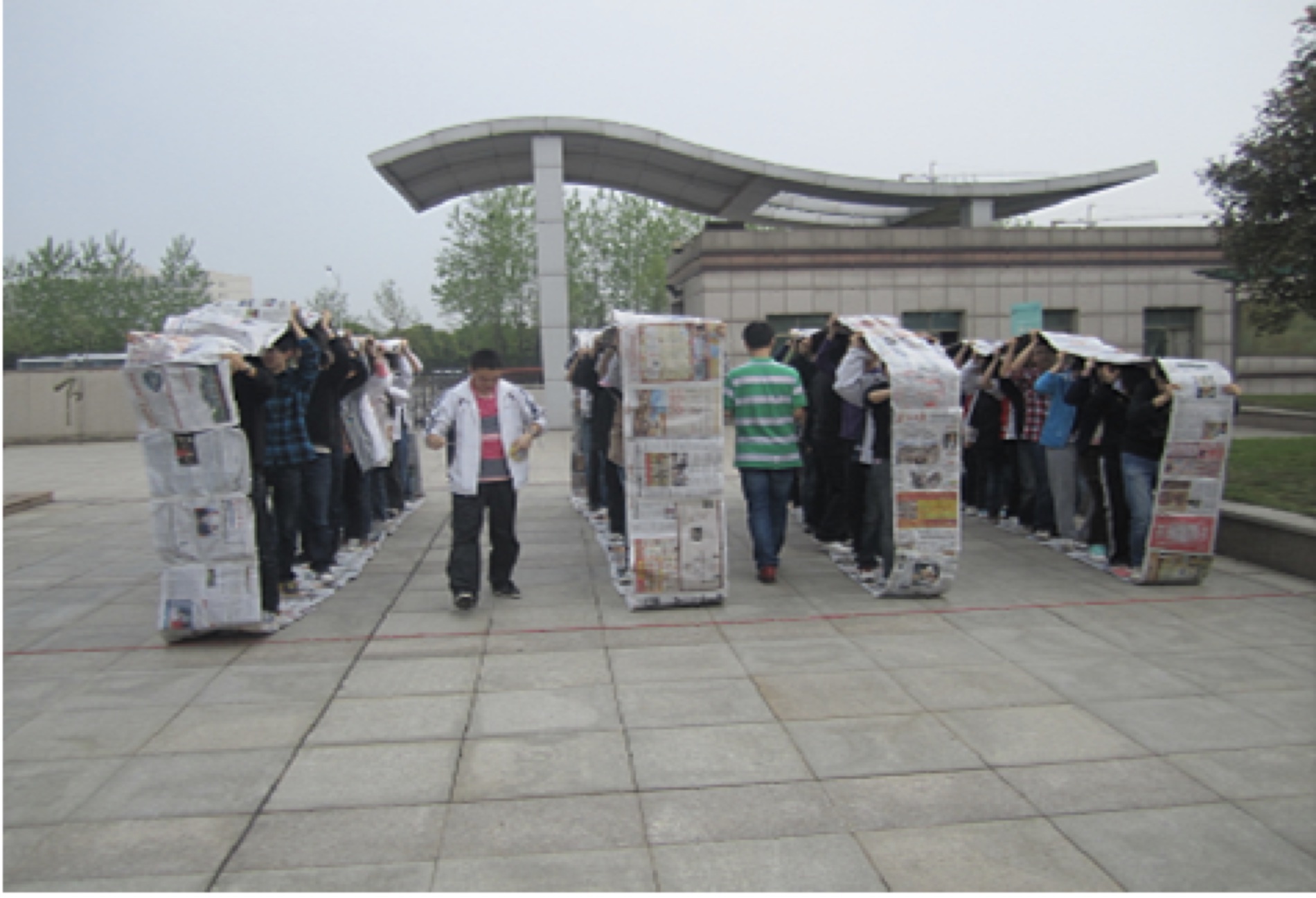 活动开始余老师就把全班分成4个小组,每个组选出一名组长和一个口号,然后同学们用响亮的声音喊出了自己的口号,给自己和同伴们给予鼓励。之后同学们就开始进行了本次团体辅导活动的“坦克履带”。在组长的带领下,每个小组的成员都分工明确,由于女生心细就担任起了重要的粘贴工作,男生担任了铺放报纸的体力劳动。在制作履带的过程中有的小组把报纸折成8开,一个个横着排放,组成一个长龙,还有的小组折成16开,竖着排成一条龙。最后每个小组在有限的时间内都做好了自己的履带,都站到了里面,开始迎接最后的挑战。